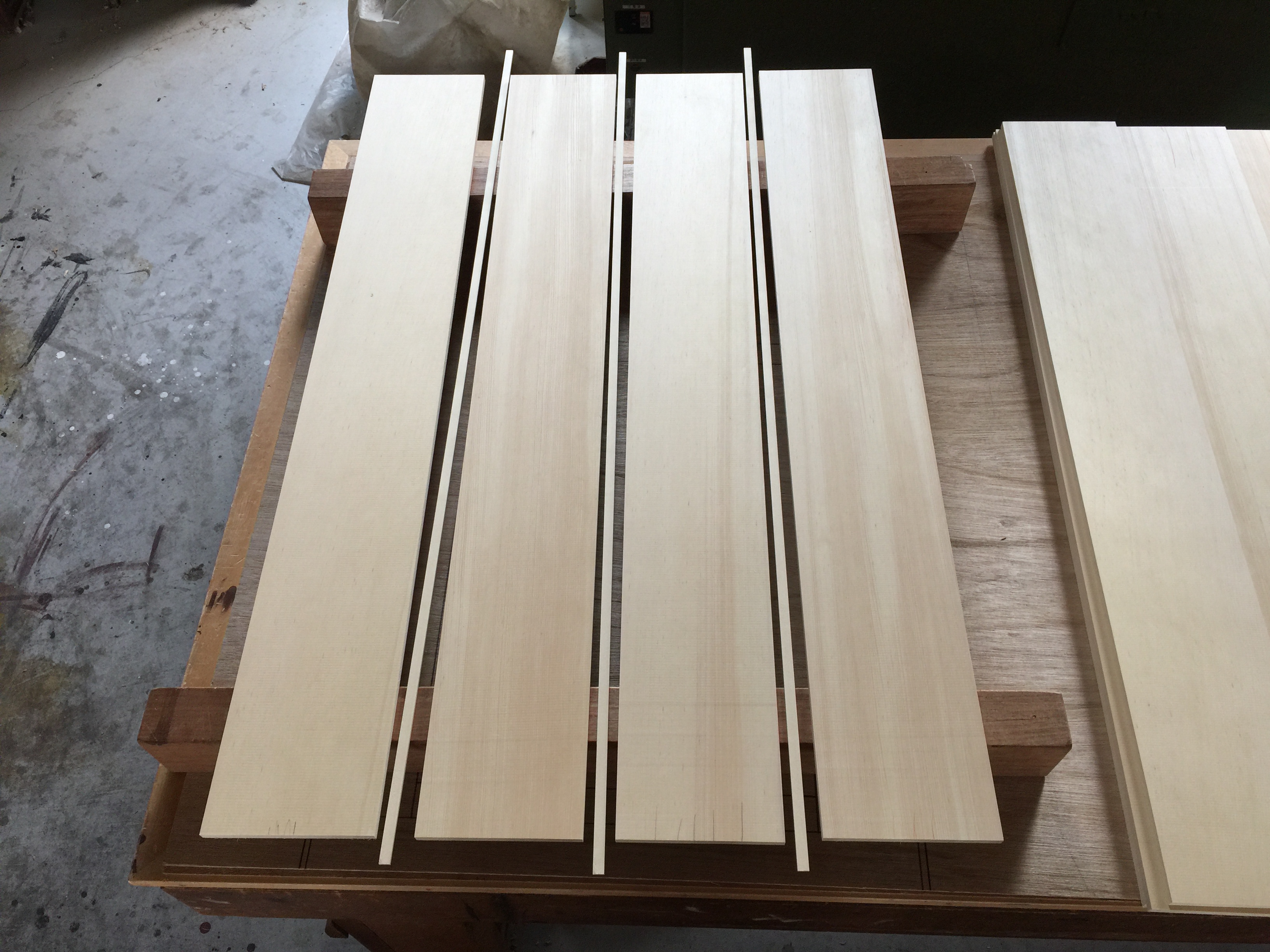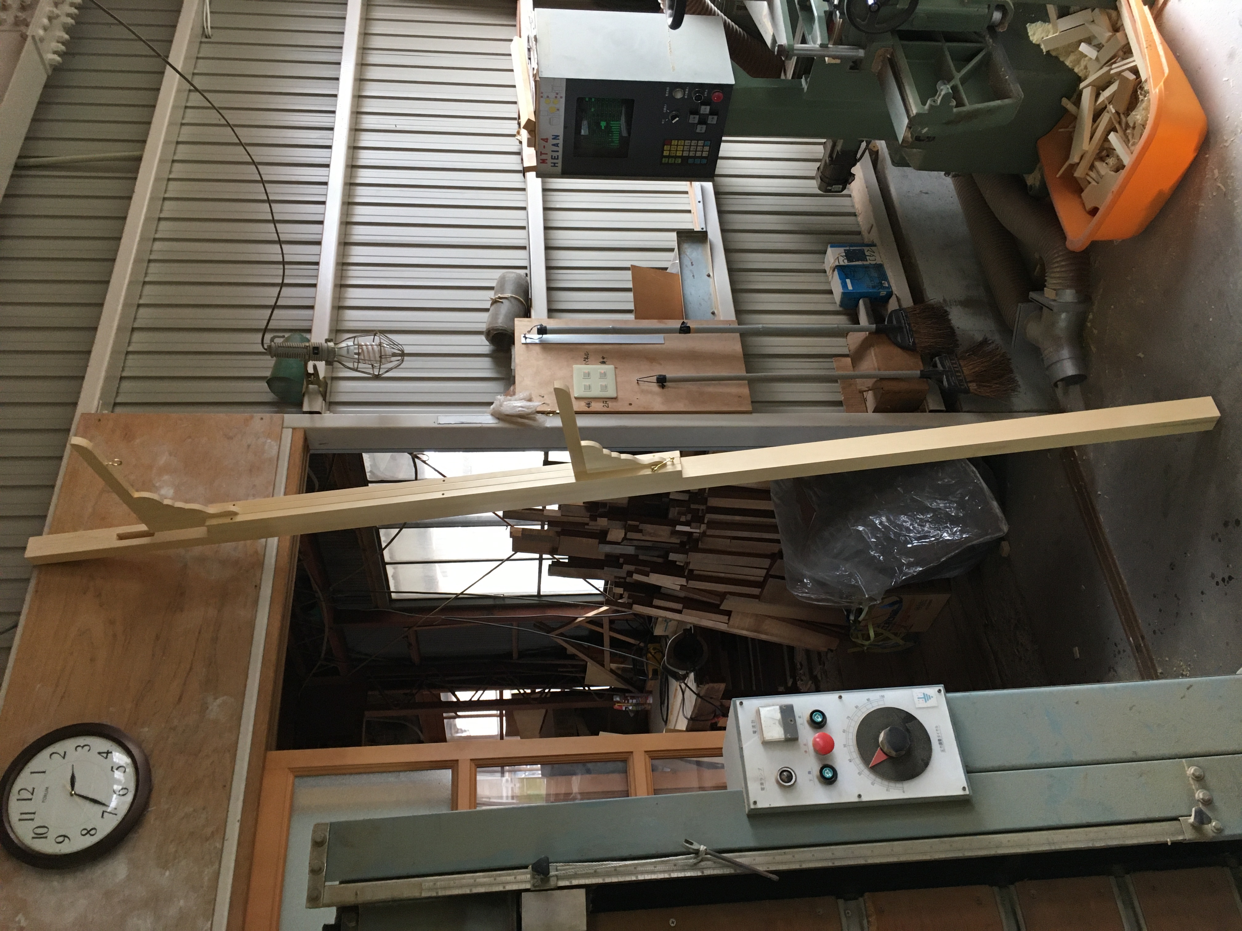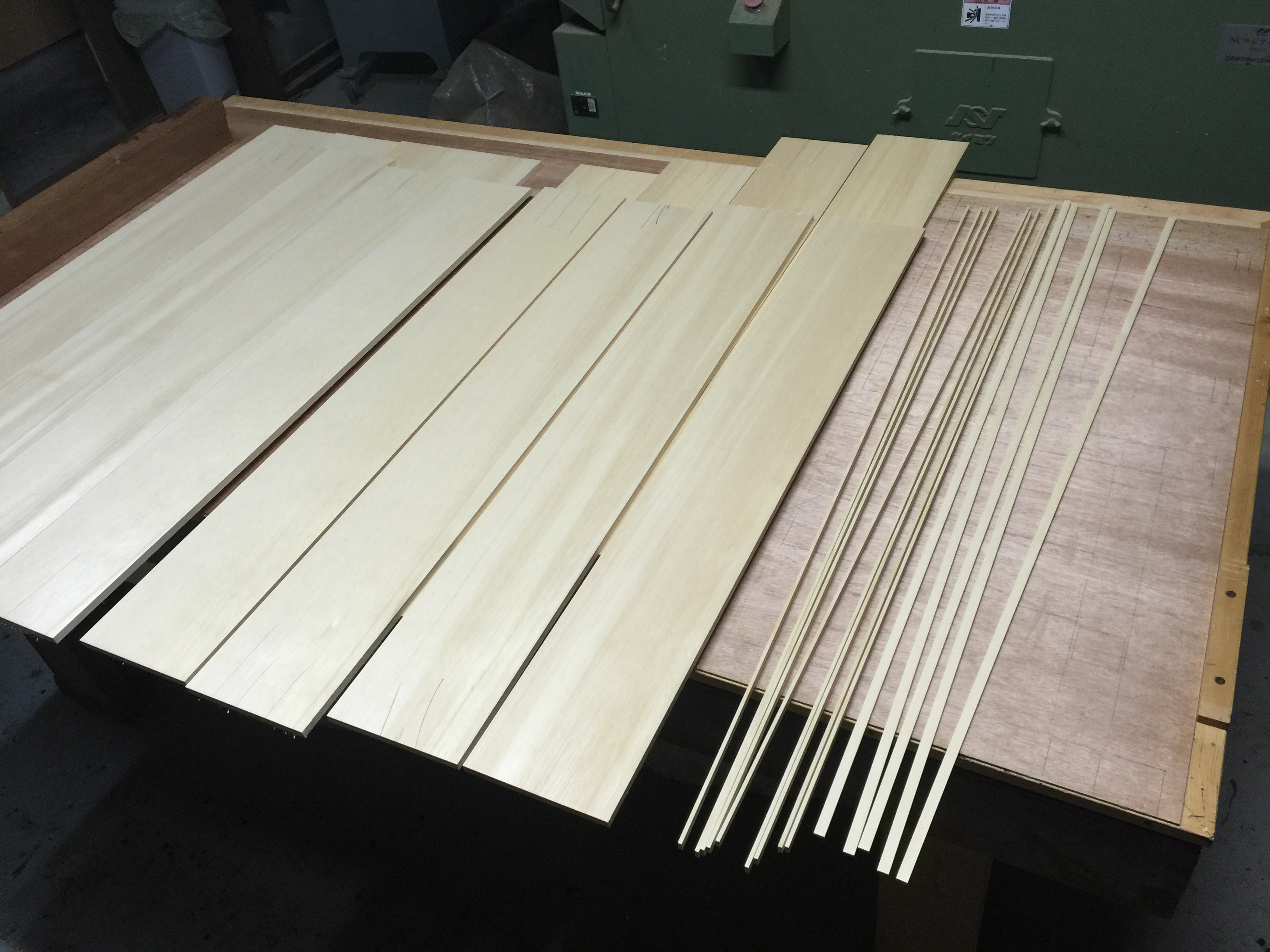 「溝付き」加工後、部材を「仕上げ」加工をします。 ・板の加工 側面や背面に使用する板を加工します。 一枚板の